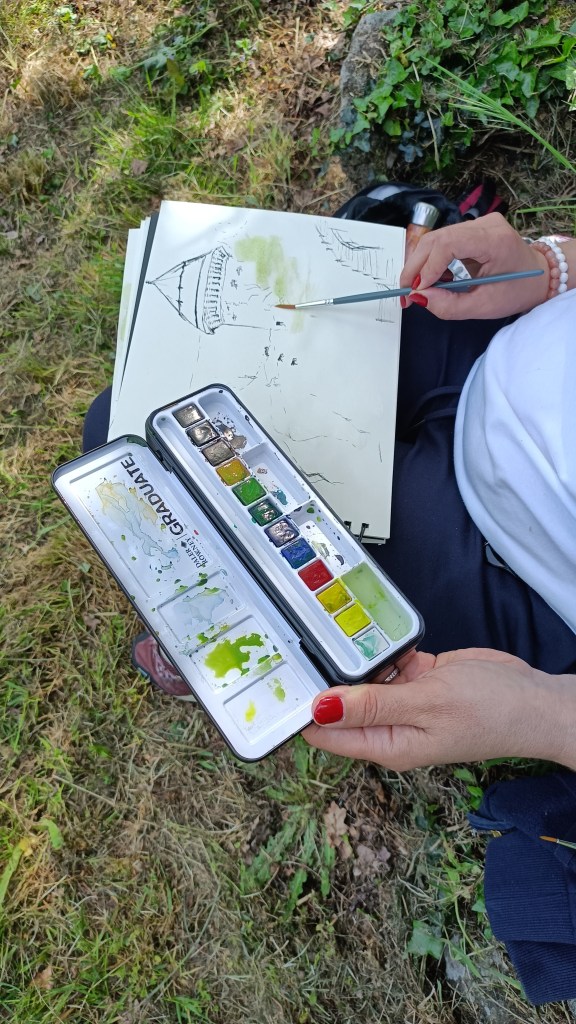 Le matin, croquis en atelier. Nous avons exploré différents outils, étude de composition et différents cadrages pour terminer par le jeu des couleurs.